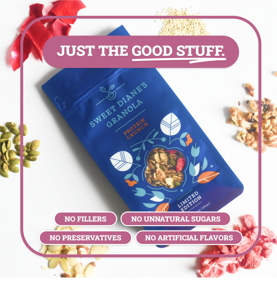 Inspired by childhood memories of her grandma's cookie jar always having some delicious treat inside, she created Sweet Diane's Original Recipe granola, and later, our other three delicious flavors! We strive to keep Sweet Diane's up to those same high standards with every batch.