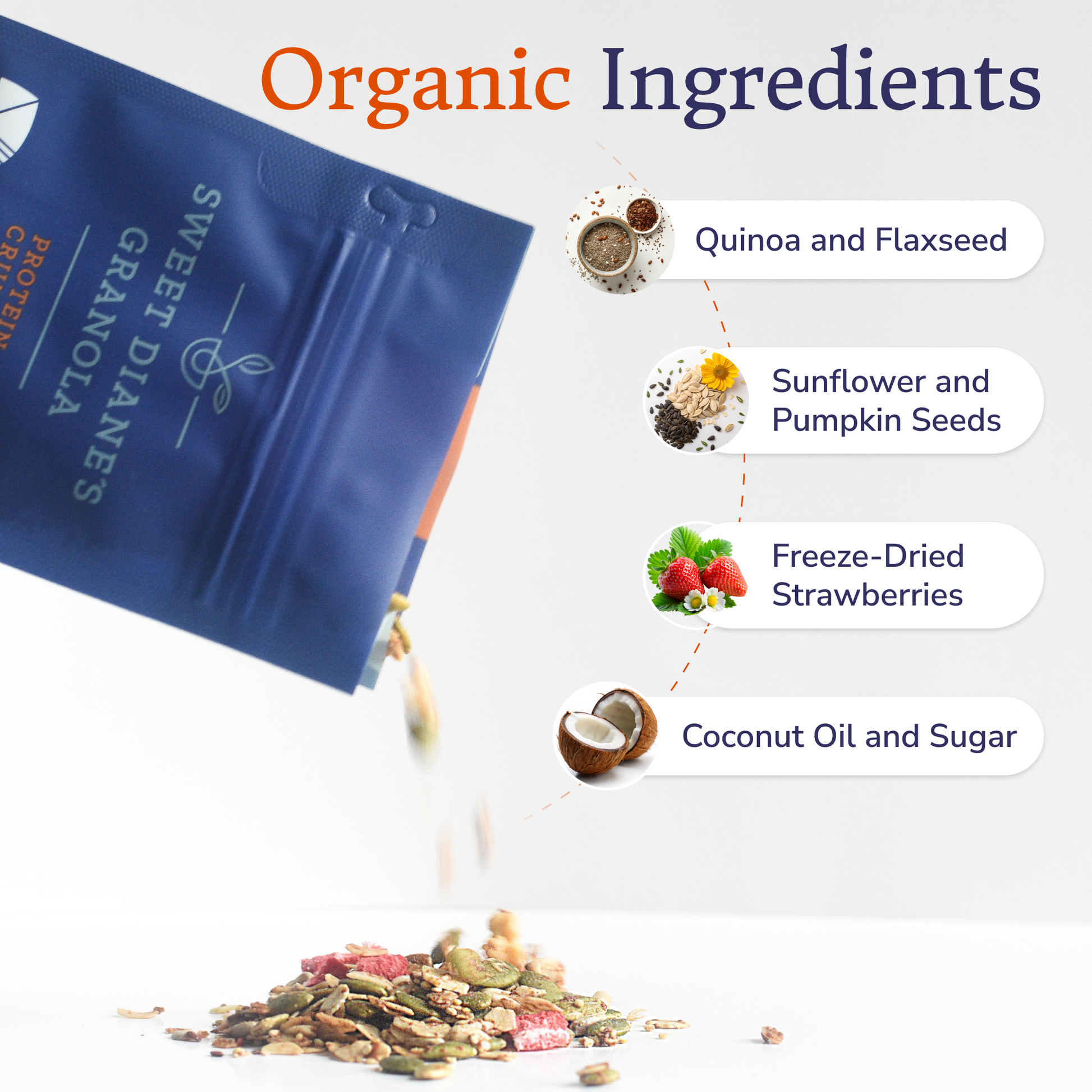 Organic gluten-free rolled oats, organic sunflower seeds, organic pumpkin seeds, walnuts, organic quinoa, organic coconut oil, organic coconut sugar, almonds, maple syrup, organic flaxseed, organic freeze-dried strawberries, sea salt, spices, pecans, natural flavors.
